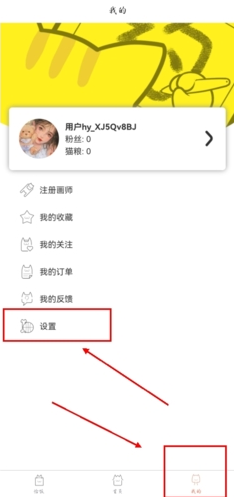 1、在约稿猫app我的里面,看到设置的选项并进入;