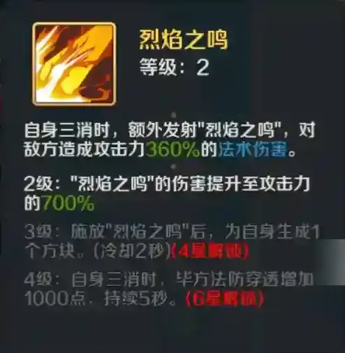 大多数三消型的英雄,其核心技是依靠三消进行触发,如例子中的毕方,自身三消时会额外触发强力的直线穿透伤害技能。