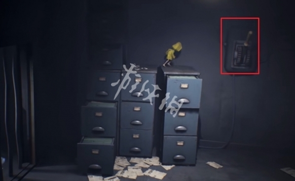 47、拉动箭头处的物体,借助它向上爬,关闭方框处的开关。