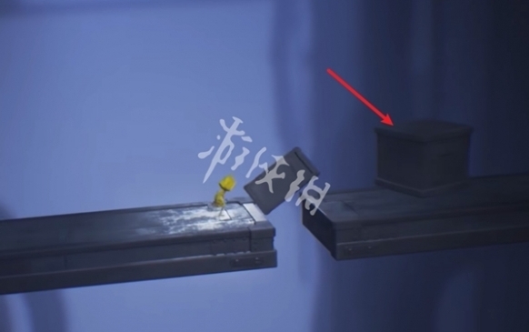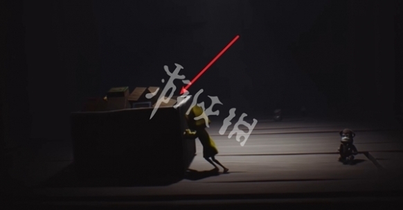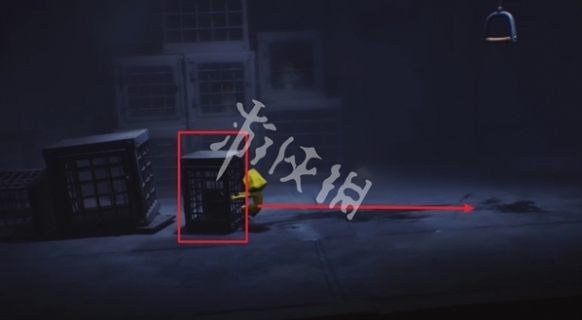 8、进入图中的场景后,拉动方框处的箱子到箭头处。