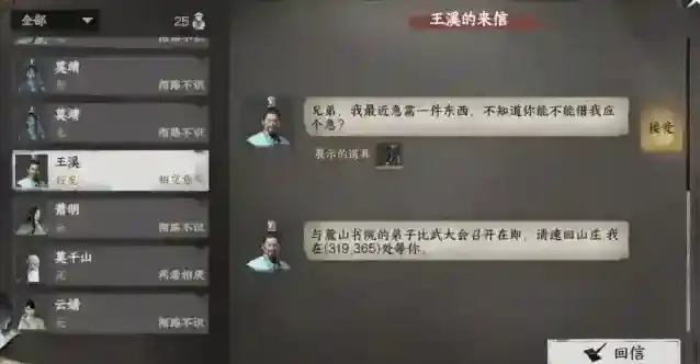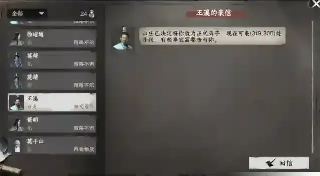 做悬赏任务将门派好感提升到25时收到王溪飞鸽