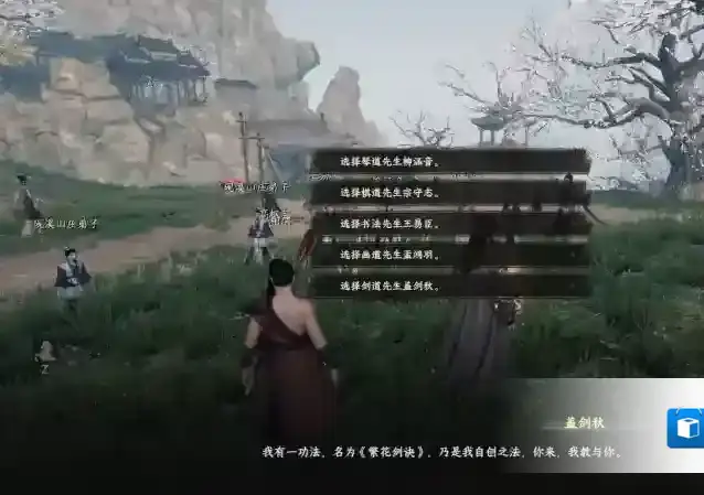 跟随指引后击败四个敌人后出现拜师选项,选择盖剑秋获得奇级剑法繁花剑诀