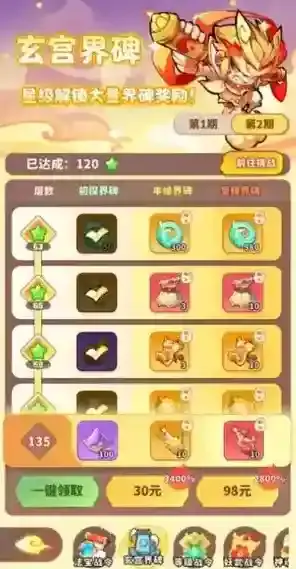 3、玄宫试炼:通关时满足试炼条件最高可以获得3颗挑战星星,挑战星数量满足条件时即可解锁玄宫界碑的奖励,另外可通过购买解锁更高阶级的界碑,从而获取更丰厚的奖励,最高可获得3230仙玉。