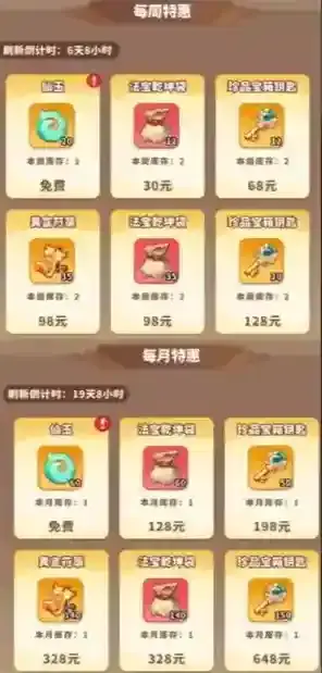 1、特惠商城:每日特惠、每周特惠、每月特惠,三个商城一个月下来可以白嫖5*30+20*4+60=290仙玉