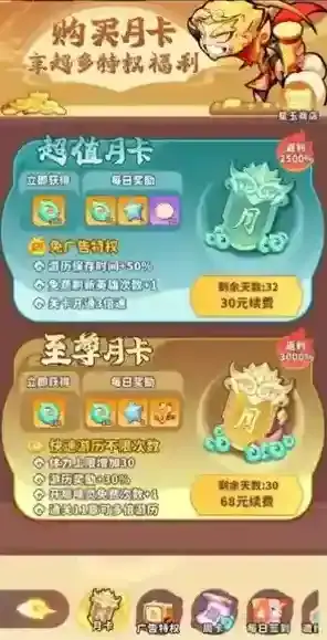 2、双月卡:购买双月卡立即获得300+680仙玉,每日签到能获得225仙玉,另外每周还能在星玉商店购买仙玉礼包,开启后至少获得188仙玉。也就是一个月至少能有980+225*30+188*4=8482仙玉。