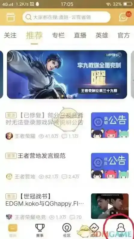 1、打开王者营地后,搜索对方的id,或直接通过个人中心的“关注”功能找到好友。