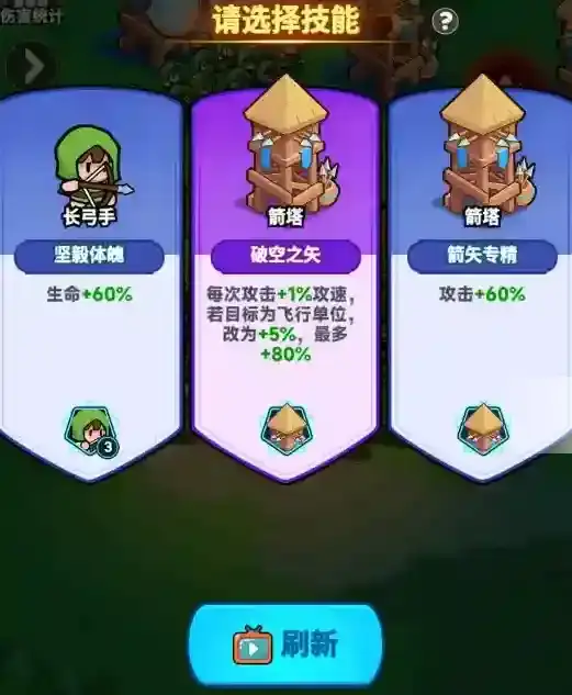 战斗中击杀一定怪物可以升级获取技能buff,优先选择将领技能、兵种攻击次数、攻击分裂和炮塔控制这一类特殊技能,选择完将领技能后优先选择推荐兵种的词条,单个种类的兵种累计选择每5次,可以获得部队晋升buff,提高该兵种的整体生命和攻击力,搭配女神祝福,增益会更加明显