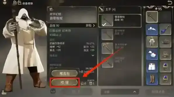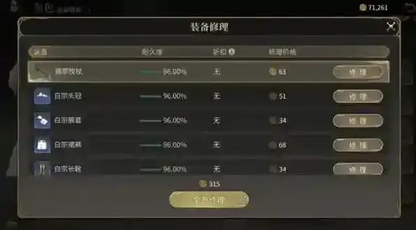 当完成一次战斗或者在战斗中团灭时,装备的耐久度会下降。当耐久度为0时装备将失去所有属性加成。在非战斗状态下进入装备界面,点击装备左下角的修理即可修理装备。修理装备需要消耗金币,耐久度越低需要消耗的金币也越多,不同部位需要消耗的金币数量也不相同。当生产职业达到50级时修理对应装备可以减少金币消耗。例如白魔法师的幻杖需要刻木匠等级达到50级即可享受修理折扣,每种装备的折扣要求可以在属性下方查看。