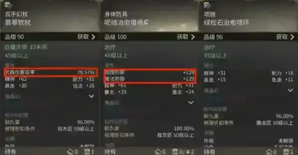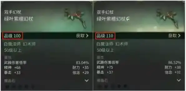 装备品级代表了这件装备的强度,无论装备是什么颜色,品级越高的装备都拥有更高的属性。其中主手的属性界面还会有武器伤害倍率,而身体部位的装备还会有物理防御及魔法防御两条属性,这些属性的高低也全都与装备品级有关,无需特别关注。除此之外大部分装备都有两条主属性与两条副属性。