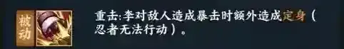奥义:这个技能的亮点就是不用续航查克拉,但缺点是要损失自身百分之二十的血量,不过换取两次普攻,收益还是蛮高的,特别是在第一回合中,能对敌人造成不少的伤害。必杀时多加一次额外普攻的机会,算一个较小的爆发。