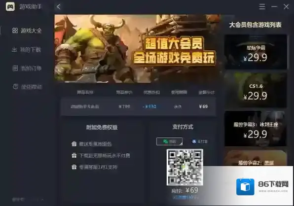 目前在本站下载魔兽争霸3游戏仅需支付29.9元就能下次玩耍了,当然了大家也可以开通69.9的游戏助手大会员,这样一来游戏助手中的游戏统统都可以下载畅玩。