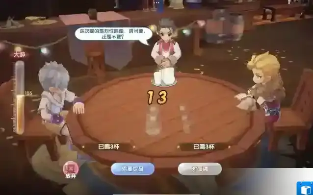 进入碰杯游戏后,侍者会先为双方各送上两杯种类、杯量随机的佳酿,之后指定一位冒险者询问是否索要指定种类、杯量随机的佳酿,冒险者可以自行选择索要饮品或让给对面。