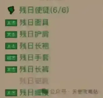 1、套装:选择残日使徒6件套,除了鞋子之外全带套装