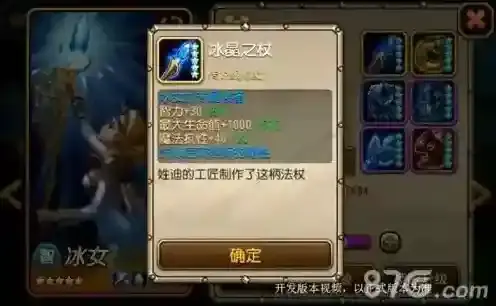 “冰晶之杖”是冰女的专属装备,充满法术的魔力。装备上它,冰女就可以增加30智力,1000生命值,40魔抗。这个外表是武器的装备,使冰女耐抗了很多。