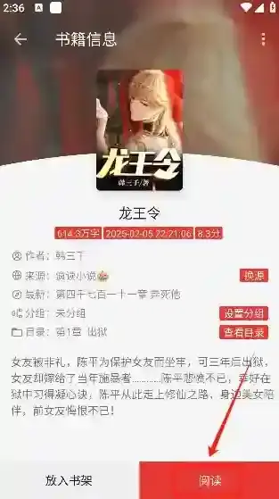 选择喜欢的小说就能够在页面了解相关的详情了,点击阅读即可快速进入到阅读页面
