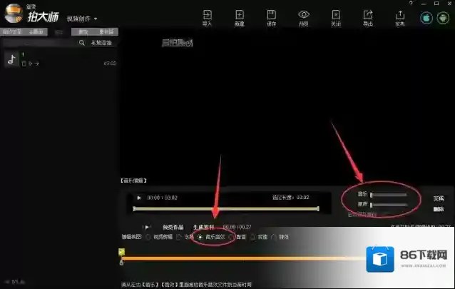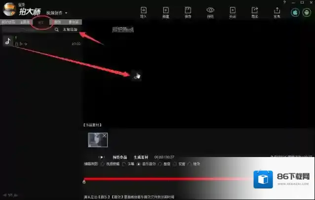 4、同样的我们在拍大师的“音乐”栏中导入一个音乐,同时也将该音乐拖动到右边,如下图所示:
