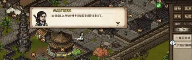 3.去(1,12)→(5,13)→(4,12)对话张洞灵,然后去(6,12)对话六扇门捕快,再去(4,12)对话张洞灵,获得「劲」buff(提升15%防、15%聚气,持续2次),最后去(6,12)对话六扇门捕快。