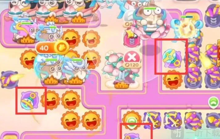 2.打掉场上的粉兔子后,锁定上方的卷轴,在萝卜处放置烟花塔,围栏的位置放置两个一级船锚;
