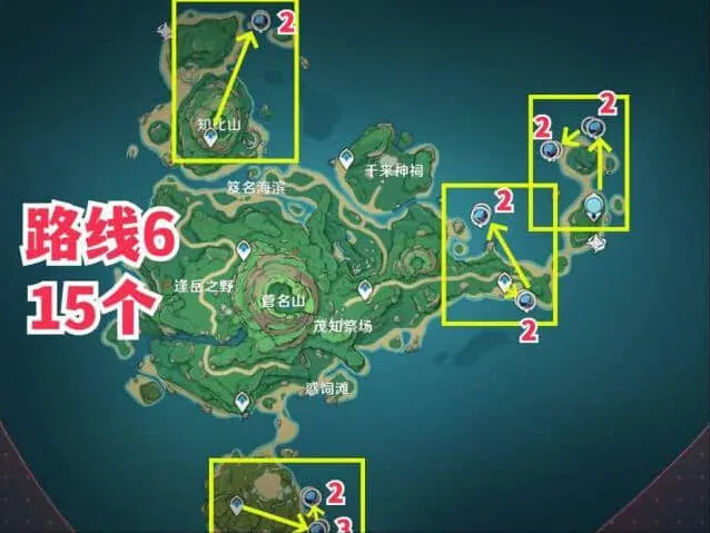 1、鸣神岛一共有24个,采集路线如下: