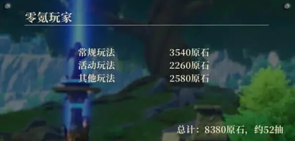基于以上游戏内容,零氪玩家总共可以获得大约8380原石,折合约52抽。