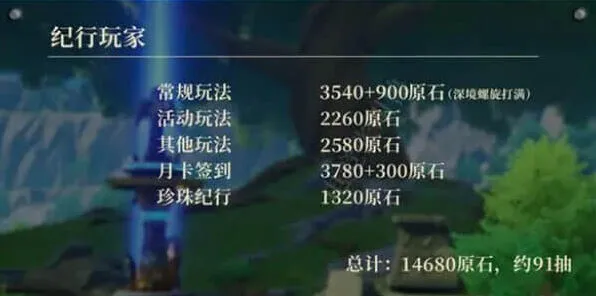 综合计算,纪行玩家总共可以获得14680原石,折合约91抽,比3.6版本少了约6次抽卡机会。