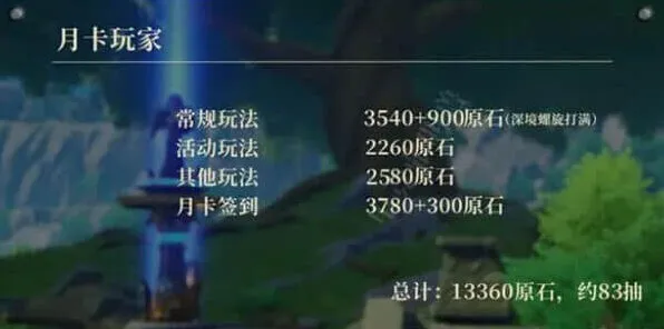 综合计算,月卡玩家总共可以获得约13360原石,折合约83抽。对比3.6版本大约少了5次抽卡机会,能不能吃保底就要看运气了!