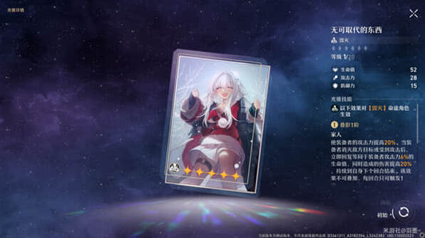 首先就是专属光锥“无可取代的东西”,消灭敌方或被攻击时立即恢复一点血量和伤害提高。白嫖的“记一位星神的陨落”不提,小毕业可用。四星前期过度的光锥可以选择“鼹鼠党欢迎你”,每释放攻击战技终结技提高一层伤害还是很好用的。三星光锥的话有啥用啥。