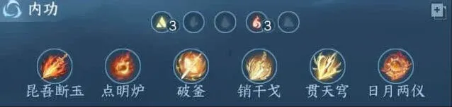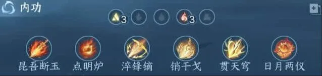 依旧是选择3金3火内功,昆吾+点名炉+日月两仪推荐必带,词条收益实在太低可以换一个擒丹火上去,其他可选有金/木凛风绝刃、揽狂风/破重云。
