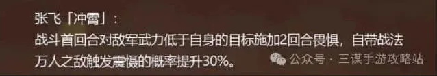 张飞的藏书阁韬略可以开局上畏惧,并且触发震慑概率提升到了30%,本来应该是很强力的。