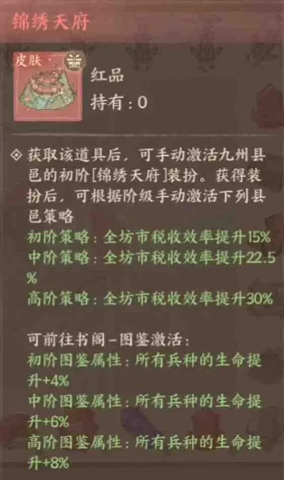 穿戴时大幅提高全坊市的税收效率(15% – 30%),图鉴加成就比较关键了,可提高所有兵种的生命值(4% – 8%)。