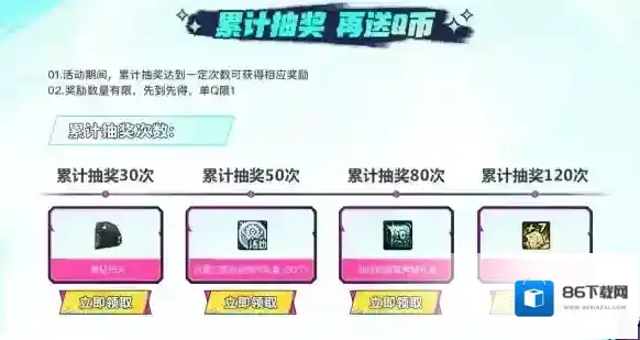 4、抽奖1次可得1积分,累积抽奖30/50/80/120次可获得阶段礼物;