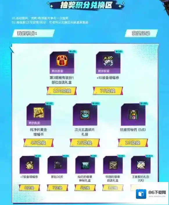 5、玩家可以用抽奖获得的积分去兑换奖励,如+10装备增幅券、黄金增幅书。