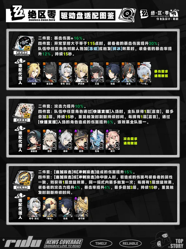 绝区零1.7双倍驱动掉落活动即将开放,不少玩家也纠结新版本驱动优先刷哪些好,这里我们还是分情况讨论,先给大家展示一波各种驱动的适用范围,大家针对自己目前培养的角色来选择优先刷取的驱动盘即可!