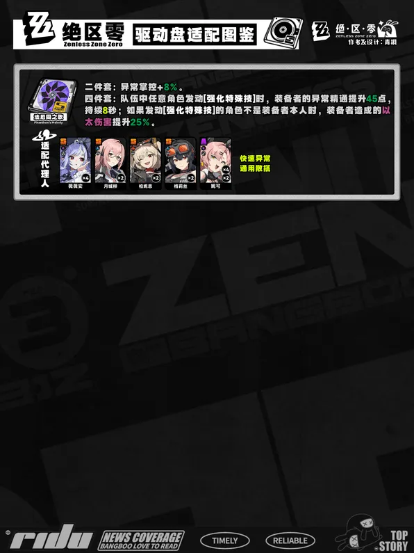 ·辅助型代理人则多以辅助定位来选择,例如:异常队中推荐搭配精通套装提升异常积蓄效率、提升buff覆盖率则以回能套装为主要搭配;