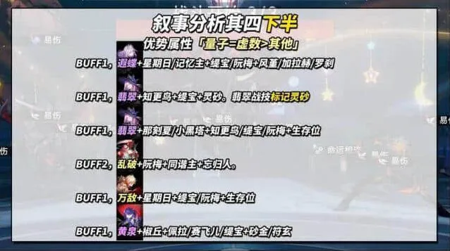 BUFF1,大黑塔+那刻夏/小黑塔+缇宝/记忆主/知更鸟+灵砂/风堇/加拉赫。