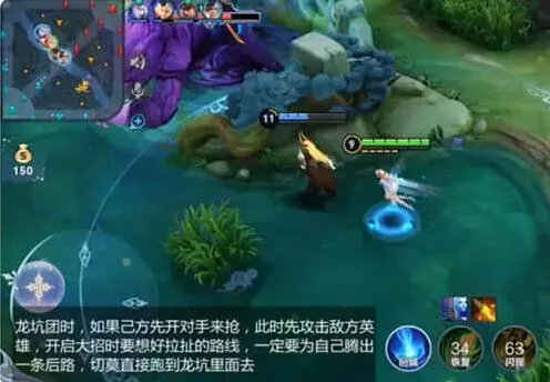 龙坑团时,如果己方先开对手来抢,此时先攻击敌方英雄,开启大招时要想好拉扯的路线,一定要为自己腾出一条后路,切莫直接跑到龙坑里面去。