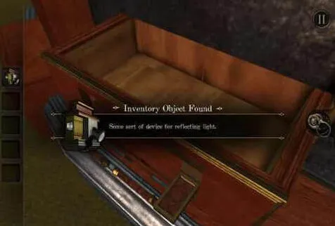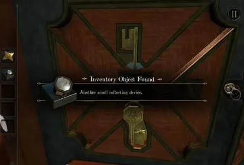 这个普通钥匙是去开双重机关的,解锁后又是个“试试”保险锁。这里就直接报答案啦,左5右4,然后左到底右到底。出现了个奇怪的装置,看起来有点像放大镜还是什么的。镜筒下方有个小印章一样的东西可以捡起来,算是个用来嵌入的方形扣子吧。