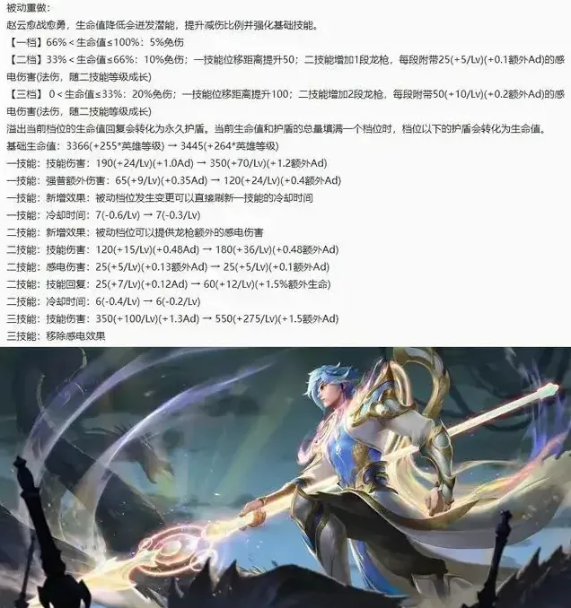 被动改为根据血量高低分为三个档位,分别获得不同程度的免伤、1技能位移距离和2技能的感电伤害,回满一个档位的血量后会转化为护盾,护盾蓄满一个档位后会转化为血量。技能加成全部改为额外Ad加成,肉装赵云坦度更高,物攻赵云伤害更高,移除大招的感电效果。