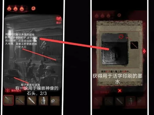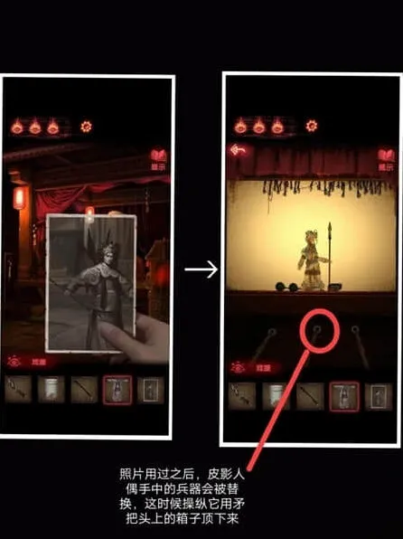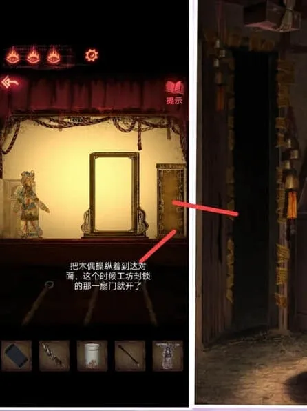 5、用钢尺切断小木偶的提线,获得它手中的钉子,这个时候戏台会垮掉,后面出现一具大木偶,需要工坊里面的大刀。