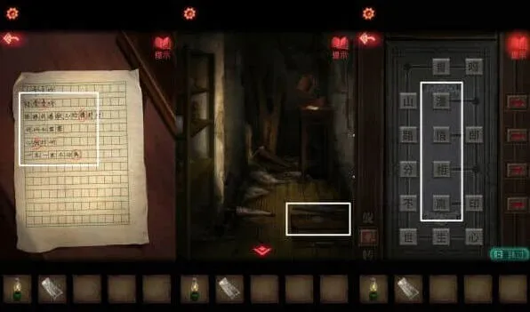 7、最后一步我们可以在墙上获得一把大刀,地方就会坍塌,使用大刀卡掉戏台上的木偶,能够后的一个奇怪的符号,回到门口,梁少平会提醒玩家机关在童子的眼睛上,关门后按照如图顺序点击按钮。