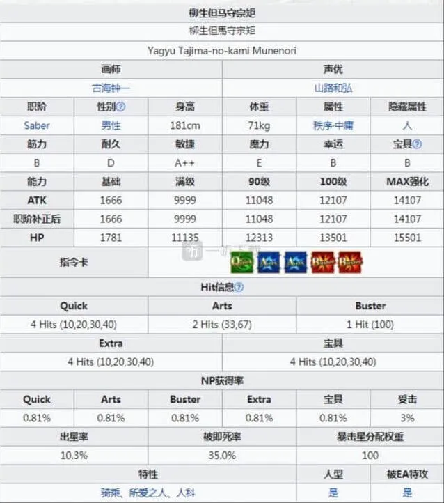 从面板来看,柳生的攻击力白值在四星剑阶从者中算是非常的优秀了,排名第四,保证了输出不会被白值拖累,同时因为不错的蓝绿卡hit比,柳生的绿卡性能非常出色,有4hit,不论是np还是暴击星获取都是不错,但是因为配卡只有一张绿卡,所以也是很难发挥绿卡的优势。但是柳生的蓝卡就比较一般了,可以说柳生的总体np水平只属于平均水平。