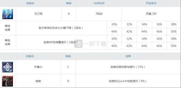 最后是3技能,单从效果来看也是很出色了,一回合的大幅度降攻配合宝具和队友的加防技能,可以直接让敌人的宝具伤害降到零,同时绑定1技能与宝具来使用的话,一回合高额的黄金律让柳生宝蓝蓝暴击可以直接达成宝具连发,升级优先度仅次于1技能。