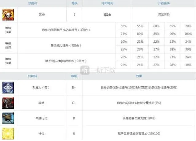 那么在此前一听小编也分析过了,绘里世的即死是比较鸡肋的,那么3技能的即死概率提升也是如此了,因为本身绘里世的宝具即死率就低于尼托,何况尼托的即死流应用度也不高呢。但是3技能的暴伤和从者特攻还算不错,算是3个技能中升级优先度排在第二位的。