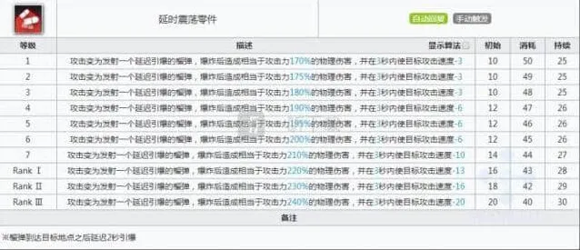 慑砂的1技能是非常普通的攻击力增加型技能,没有太多可说的,只能说数值还算合格,但是确实没太大亮点,可能在某些很难阻挡住很多敌人的场景下可以携带1技能以防止榴弹空炸吧。一般情况下我们当然是要使用2技能的。