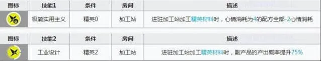 慑砂的基建技能算是比较有用了,因为在加成材料概率的同时还可以减少心情消耗,不过也仅止于此了,毕竟我们还有概率100%的年和一众概率80%的干员呢。