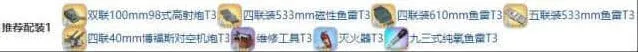 推荐理由:对标枪来说,三个金驱逐主炮的输出差距微小,自己根据地图情况选择吧。就生存来说射速更快的双联100mm98式高射炮,增加技能buff覆盖率挺好。自律推图:推图中进场动画大概有2s左右的时间,这会造成鱼雷/主炮/空袭时间延后2s,所以拥有独角兽+傻白双buff时推荐金五联533;单buff时,推荐金四联磁雷;没有buff的时候要么不卡技能,直接用四联610或者五联533,要么卡技能用三联磁性鱼雷。因为从发射到命中,必须在这5秒内完成,超出了5秒就没有加成。