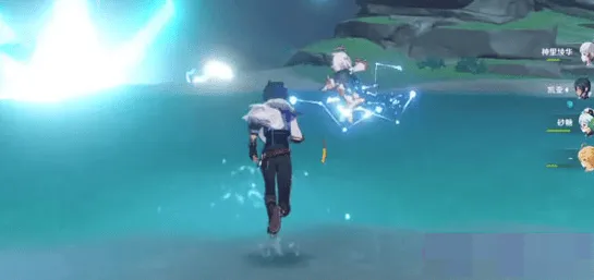 4、当我们利用这个操作耗尽了三次体力之后,将人物切换至水面之上,利用神里的技能制作冰面。