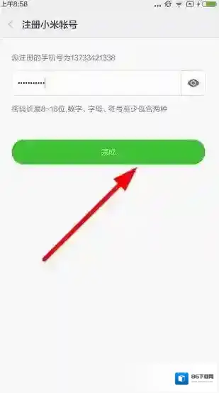 4、在注册小米账号的位置,你要设置你的密码!然后点击完成!密码长度8-16位,数字、字母、符号至少包含两种!