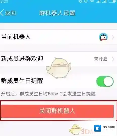 3.点击群机器人设置页面,可以看到群成员生日提醒和开启新成员进群欢迎。选择你要关闭的功能,如果关闭群机器人,请选择底下红色按钮。即可关闭QQ小冰。