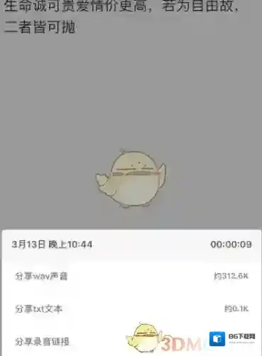 点击分享图标可将录音生成为wav声音、txt文本、录音连接保存与分享